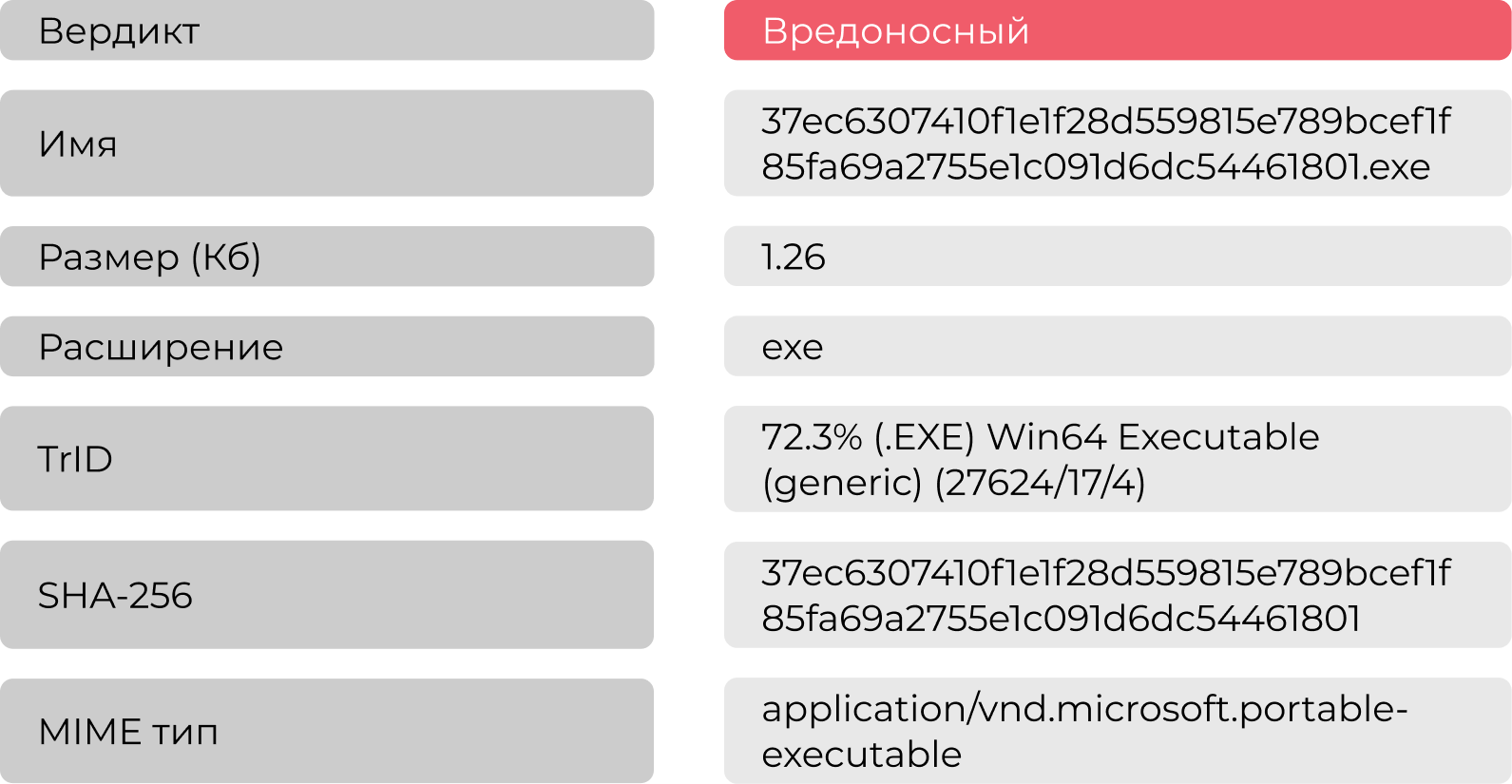 На анализ в систему ATHENA пришел исполняемый файл с расширением .exe. Для начала была собрана его общая информация, представленная в таблице Таблица 1.