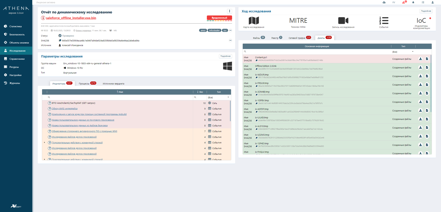 Динамический анализ в системе AVSOFT ATHENA выявил несколько вредоносных индикаторов:
