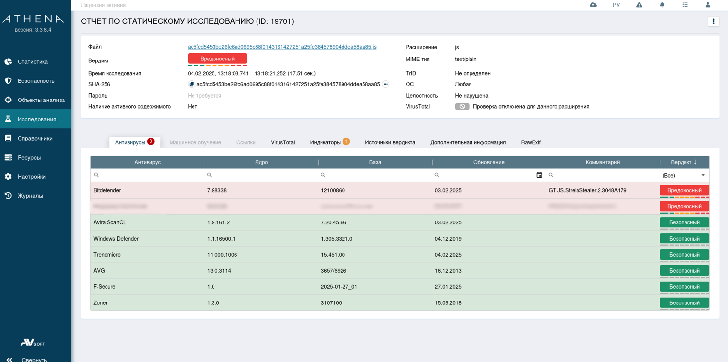 Исследования файла происходило с помощью системы ATHENA. Посмотрим на статический и динамический анализ файла в системе ATHENA.