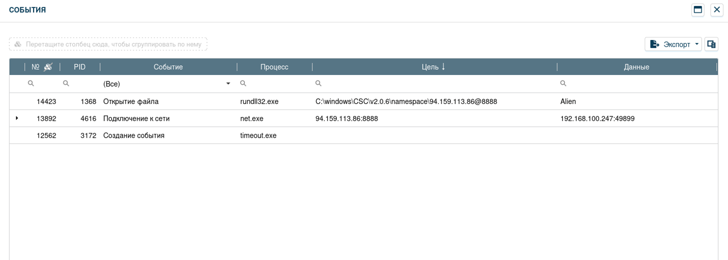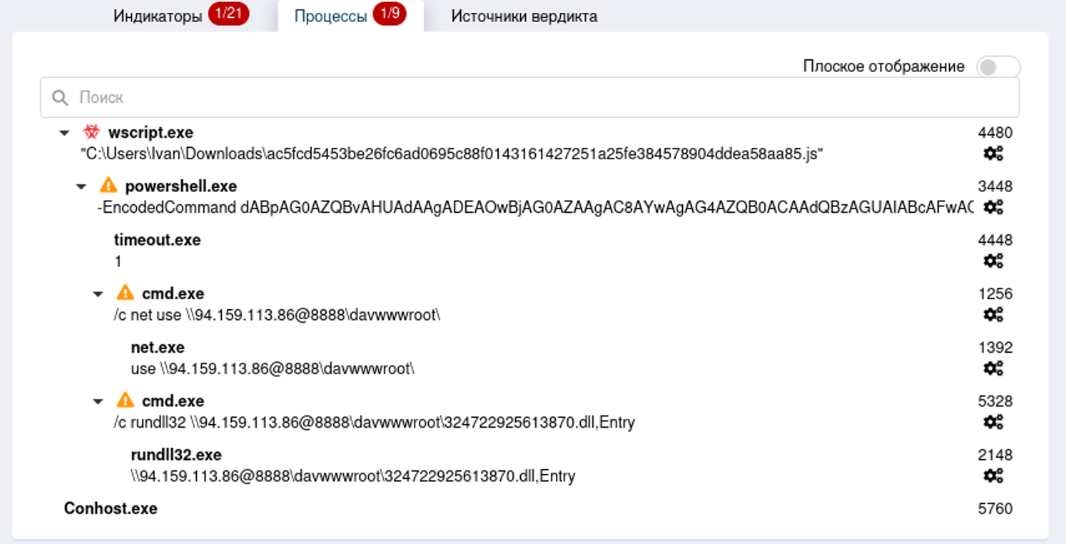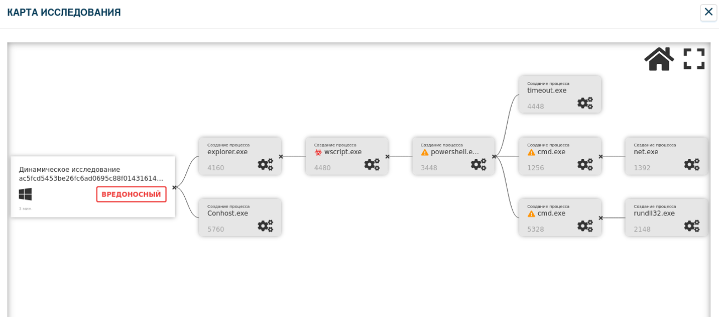 В ходе динамического анализа среди системных программ были обнаружены wscript.exe, powershell.exe, timeout.exe, cmd.exe, net.exe, rundll32.exe, Conhost.exe и svchost.exe.