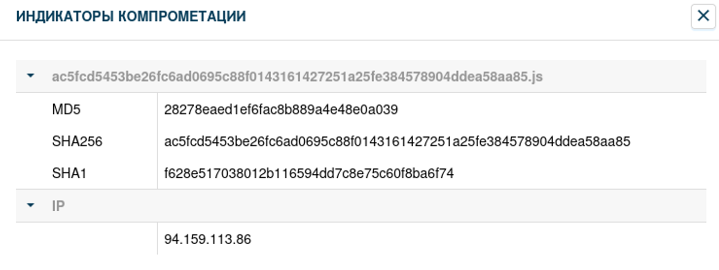 Во вкладке “Индикаторы компрометации” отображаются индикаторы компрометации вредоносного поведения файла по результатам его проверки в «песочнице».