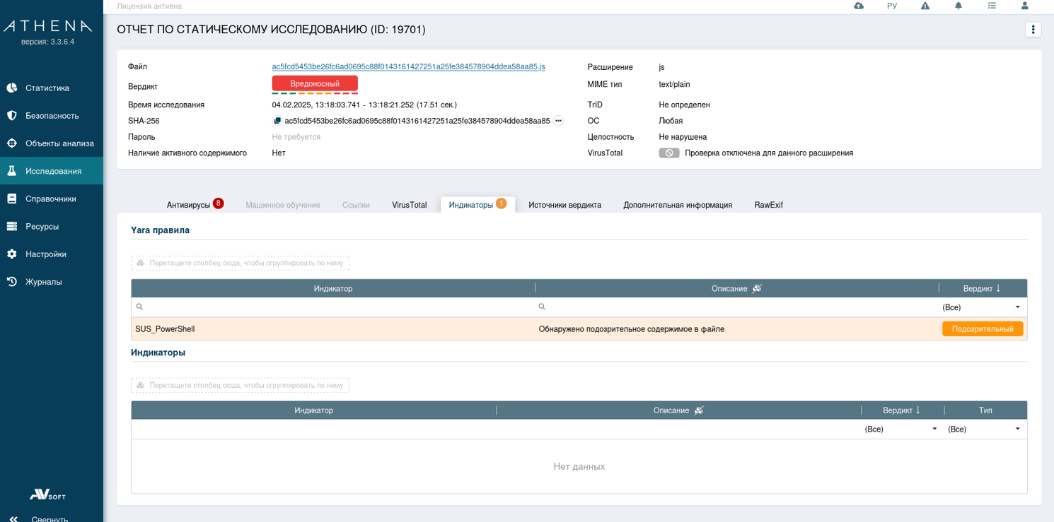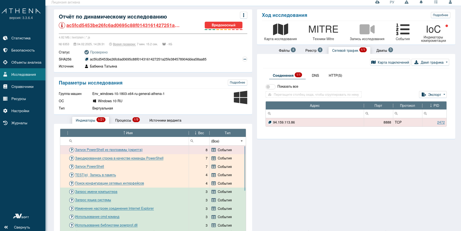 При динамическом анализе в системе AVSOFT ATHENA сработало несколько индикаторов: