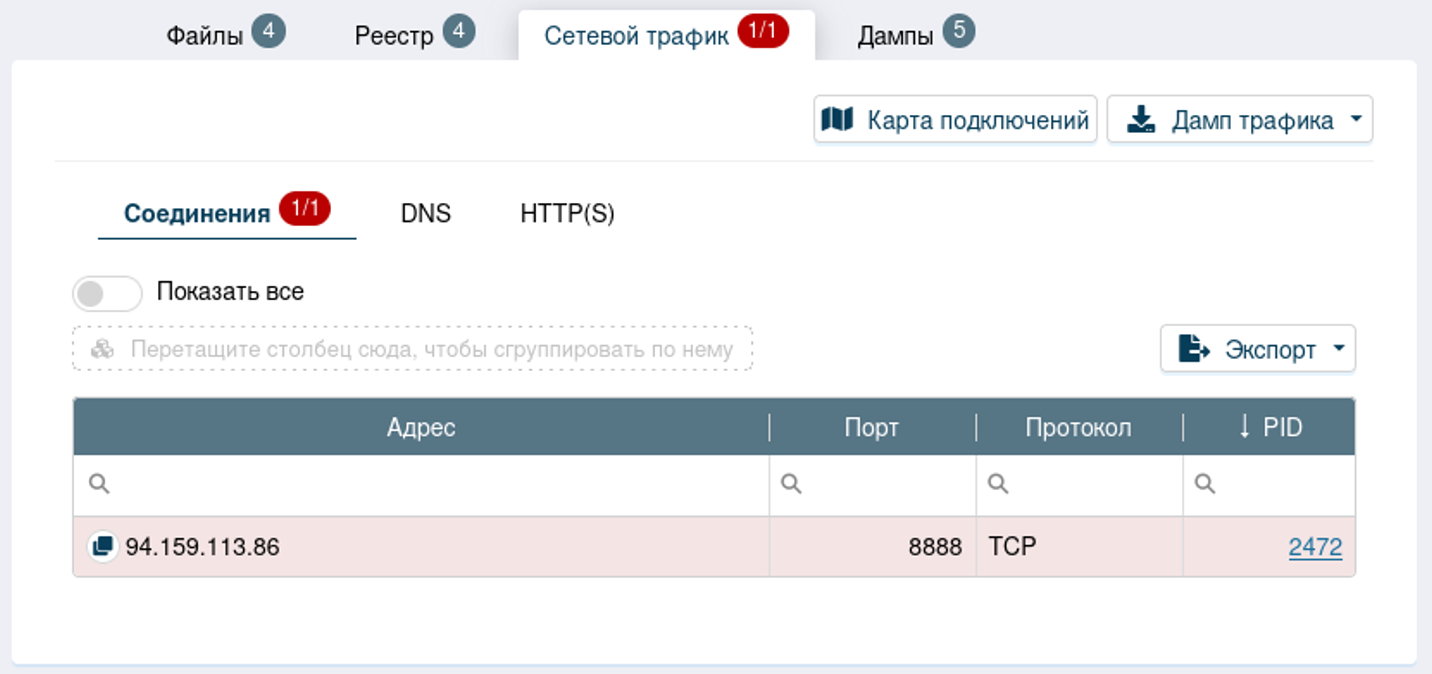 Во вкладке «Сетевой трафик» видим, что была обнаружена вредоносная ссылка. При переходе в отчет можем увидеть, что данный IP-адрес находится в черном списке доменов.