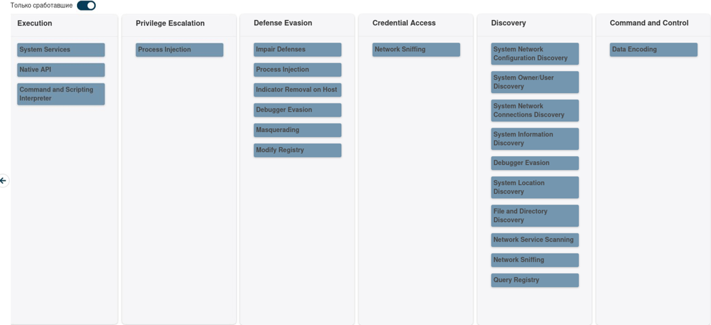 Во вкладке «Техники MITRE» видно, что отработало несколько техник.
