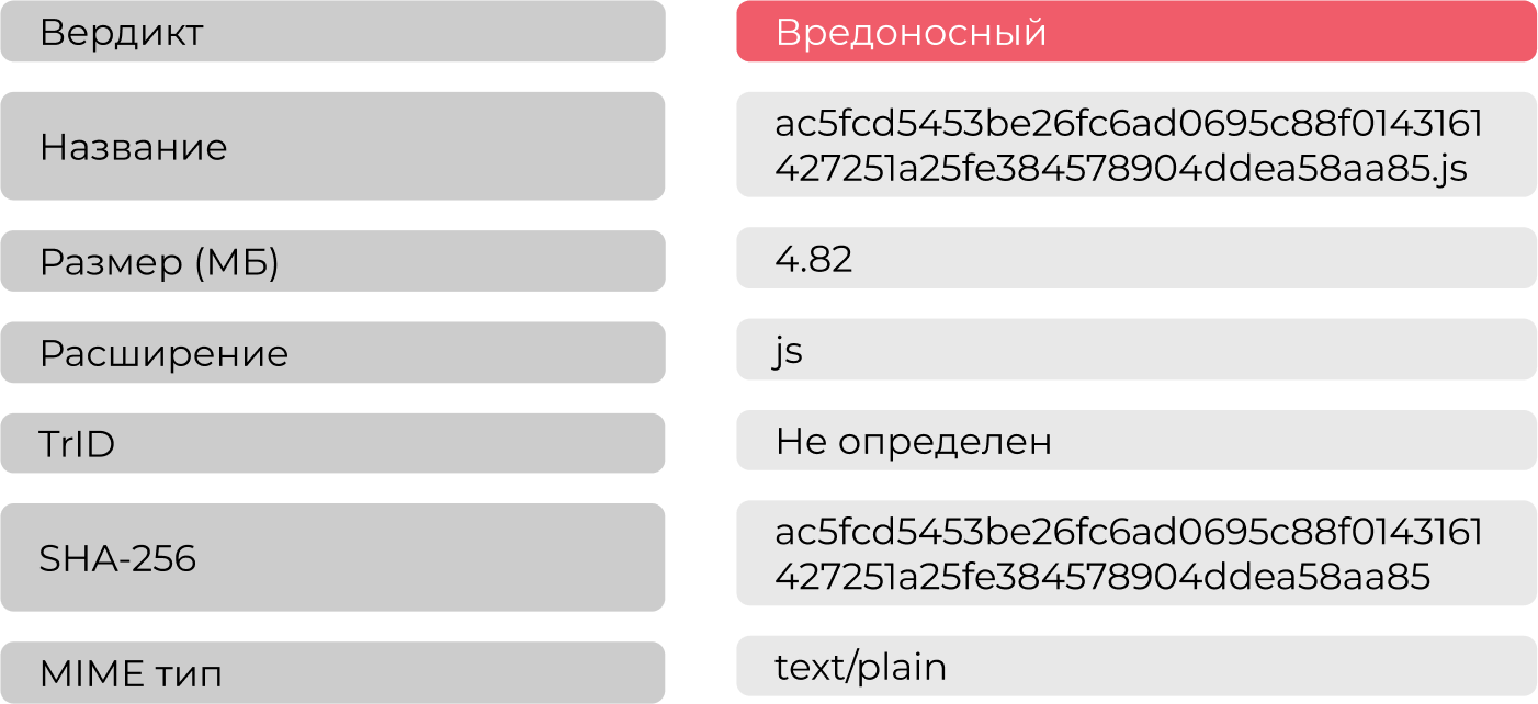 На анализ в систему ATHENA пришел исполняемый файл с расширением .js. Для начала была собрана его общая информация, представленная в таблице Таблица 1.